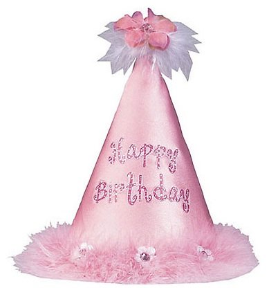 Give your little one something special to wear on her birthday. 1st birthday princess hat measures 10 1/2" x 7" and features a sparkling happy birthday message, floral & feather embellishment on top and pink marabou trim.