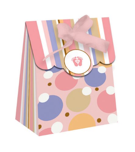 Diecut fold-over favor bags include coordinating pink ribbons tieing the top closed. Bags measure 4.5 inches tall by 3.5 inches wide by 1.5 inches deep. Matches our Tiny Toes Pink baby shower theme; 12 per package.